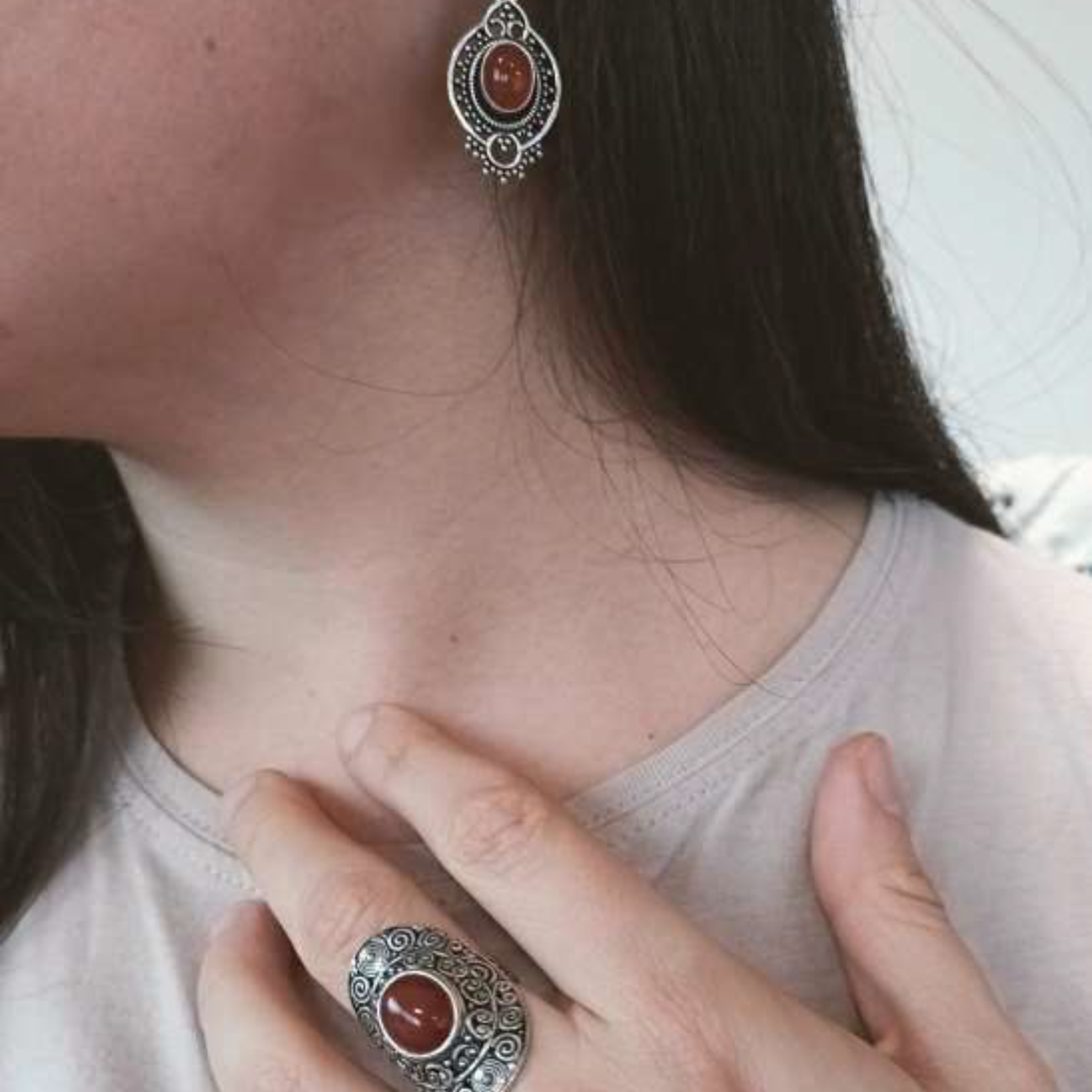 L’Anello Sundara esibisce una pietra di onice rossa incastonata in ottone placcato argento, creando un contrasto elegante e deciso. Il metallo lucido supporta la pietra centrale, offrendo un gioiello dallo stile deciso e raffinato.