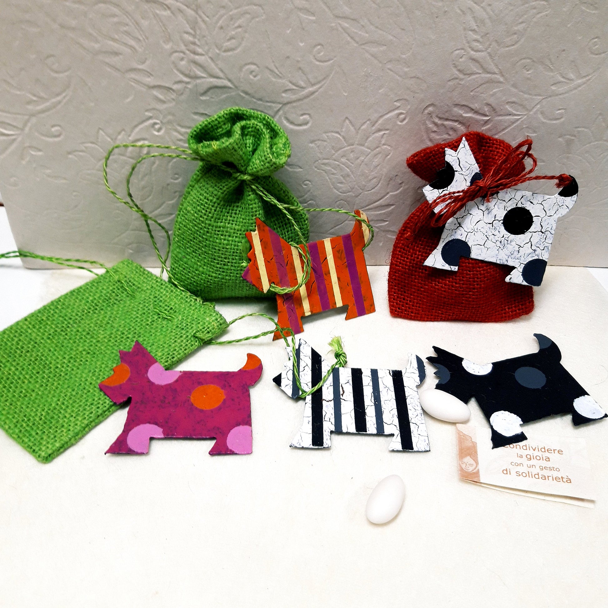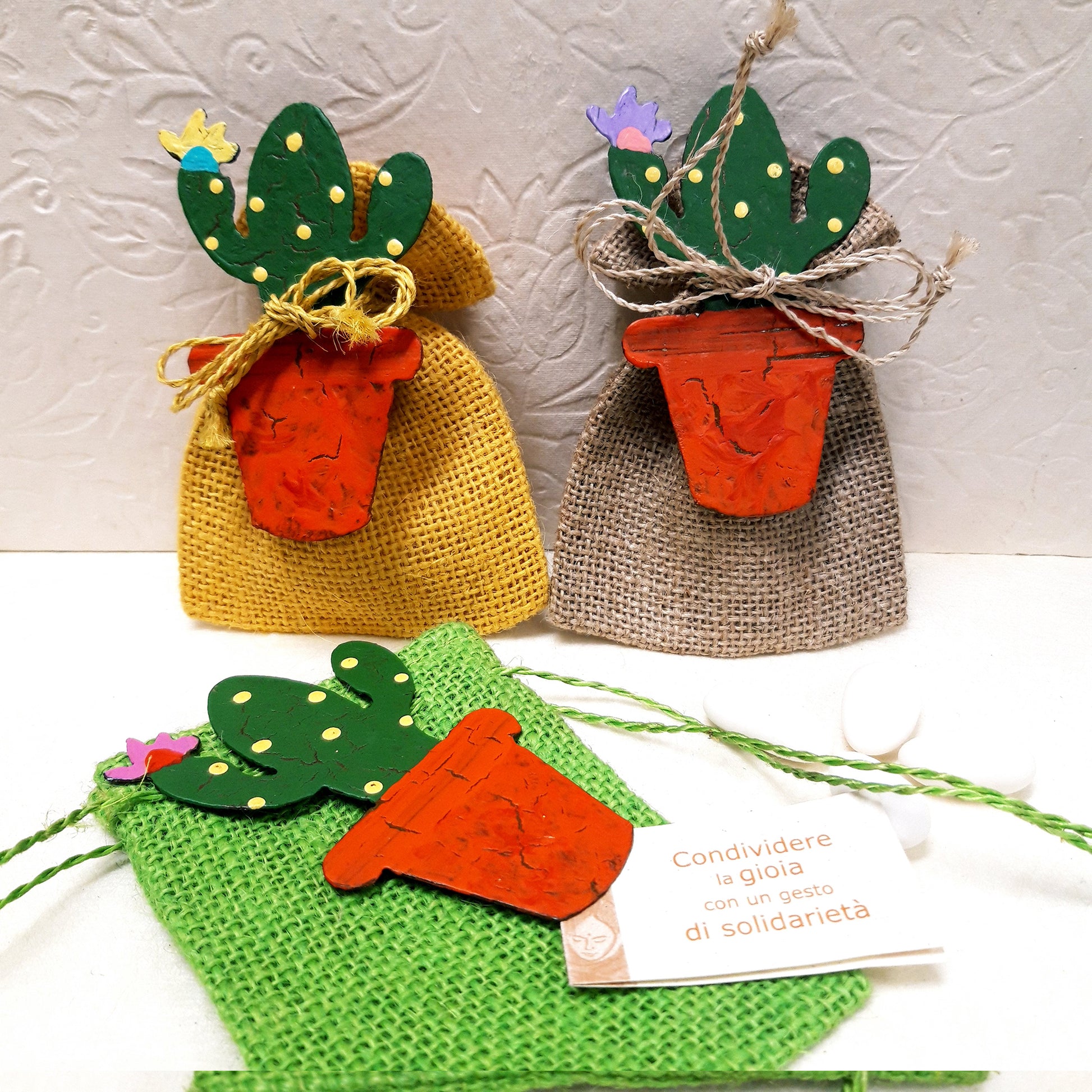 Il sacchettino in juta può essere scelto in vari colori e contiene 5 confetti alla mandorla e bigliettino personalizzato.