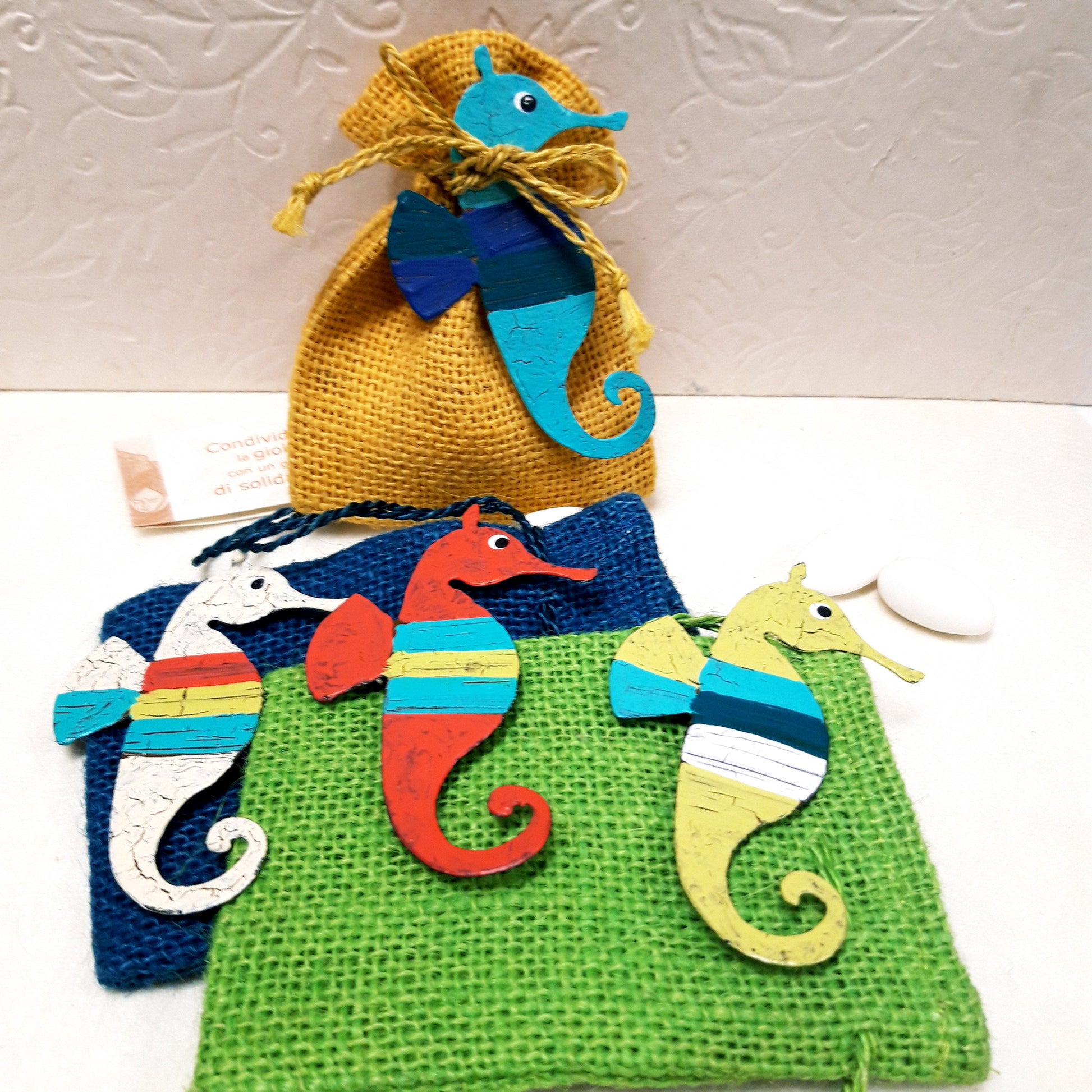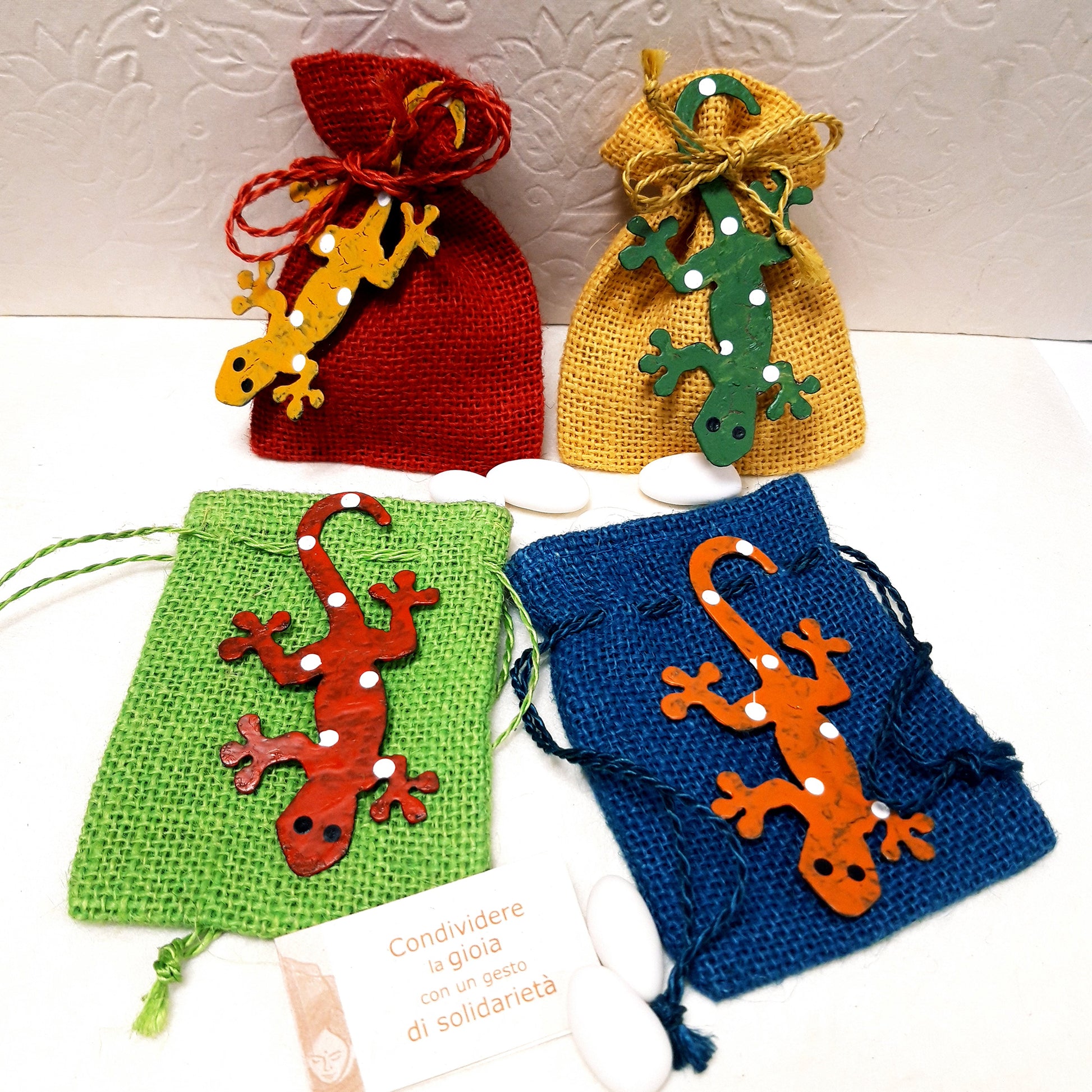 Bomboniera Comunione e Cresima sacchettino decorato da calamite con diversi soggetti realizzati dagli artisti di Oxidos (Colombia):