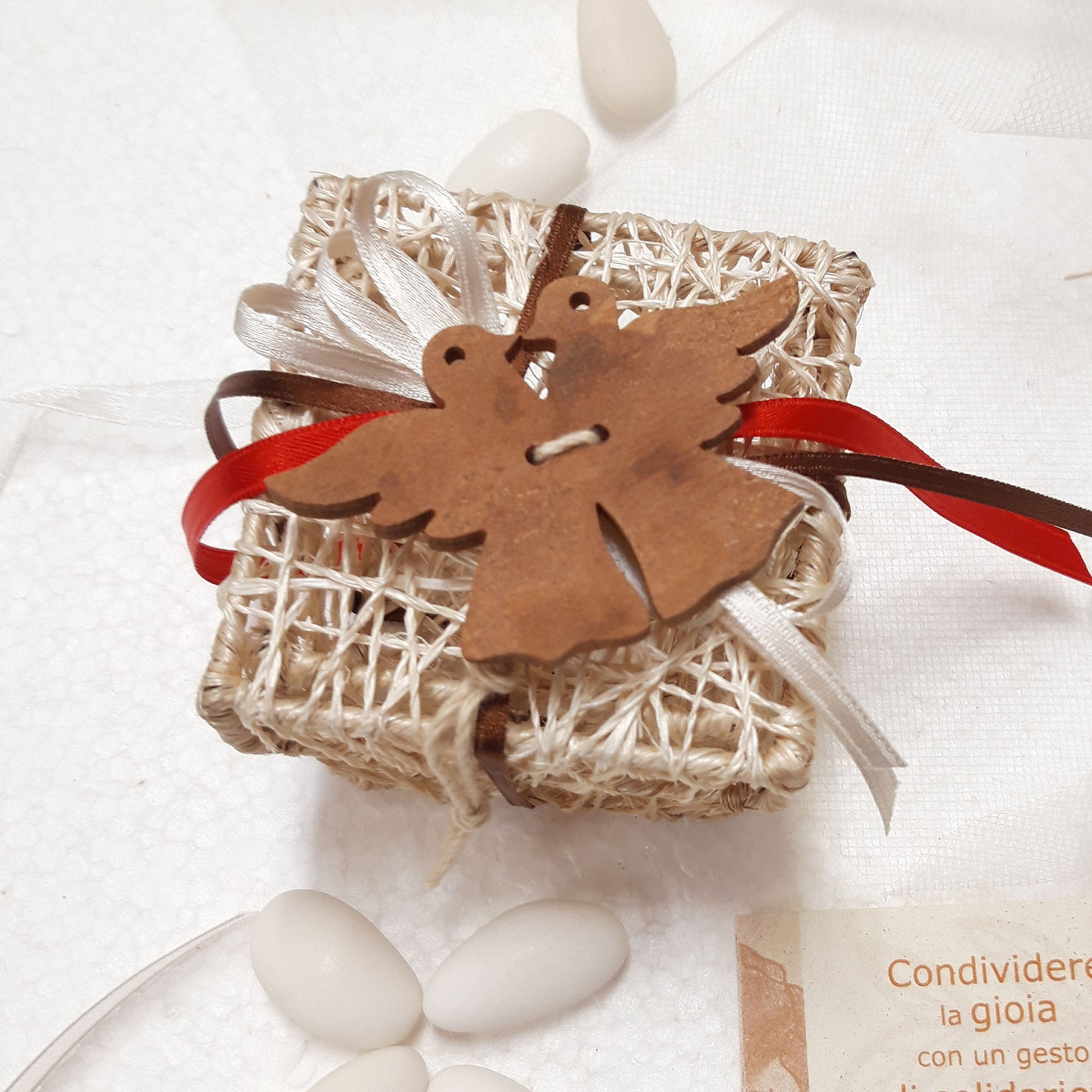 Bomboniera solidale scatolina in fibra naturale con colombine in legno di cannella | confezionata