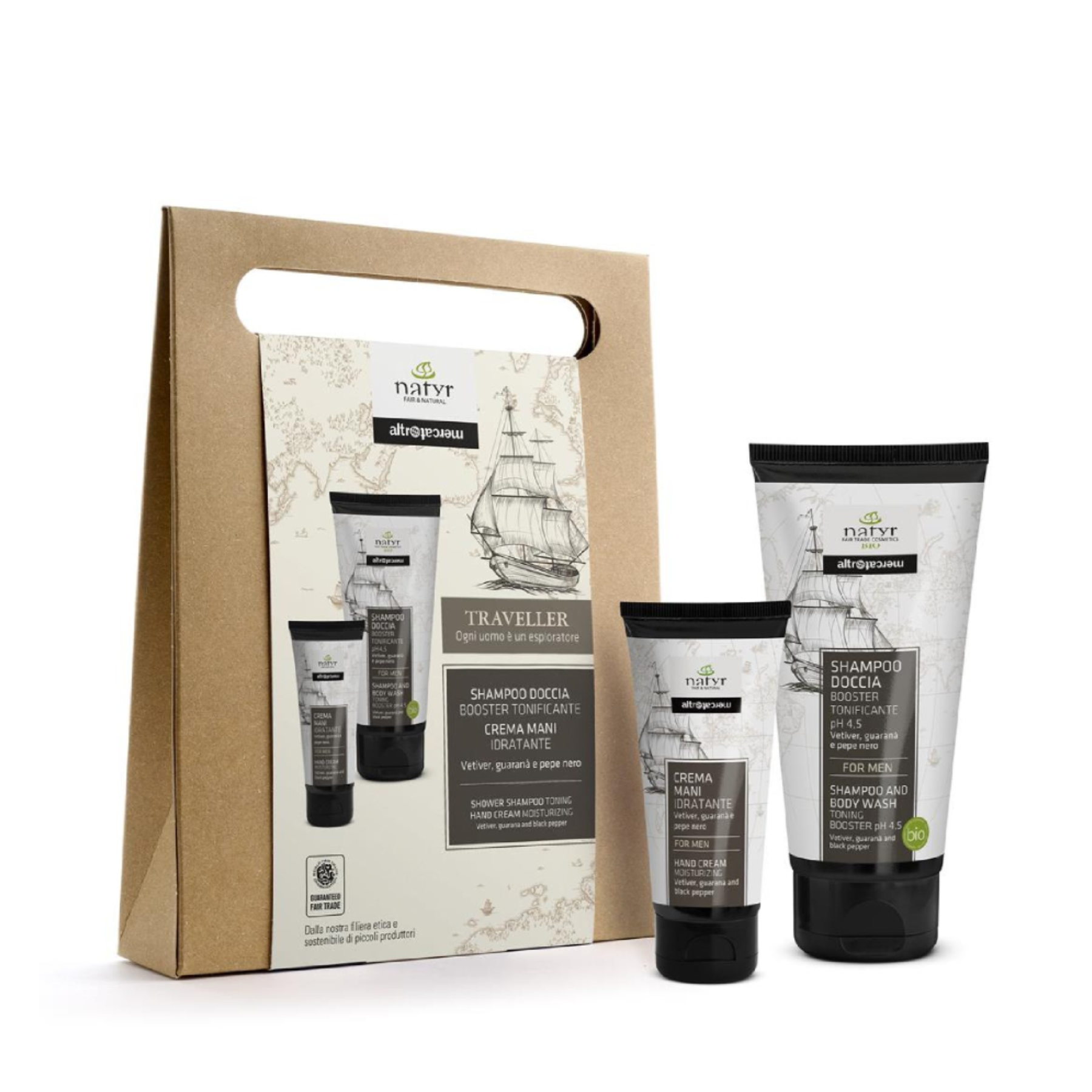 Un cofanetto regalo con prodotti biologici in formato da viaggio realizzati con pregiati ingredienti da filiere solidali come il vetiver e l’olio essenziale puro di pepe nero dello Sri Lanka. Contiene una crema mani lenitiva e uno shampoo doccia con azione tonificante ed energizzante. Un’idea regalo della linea Natyr for Men per chi ama viaggiare e prendersi cura della propria pelle