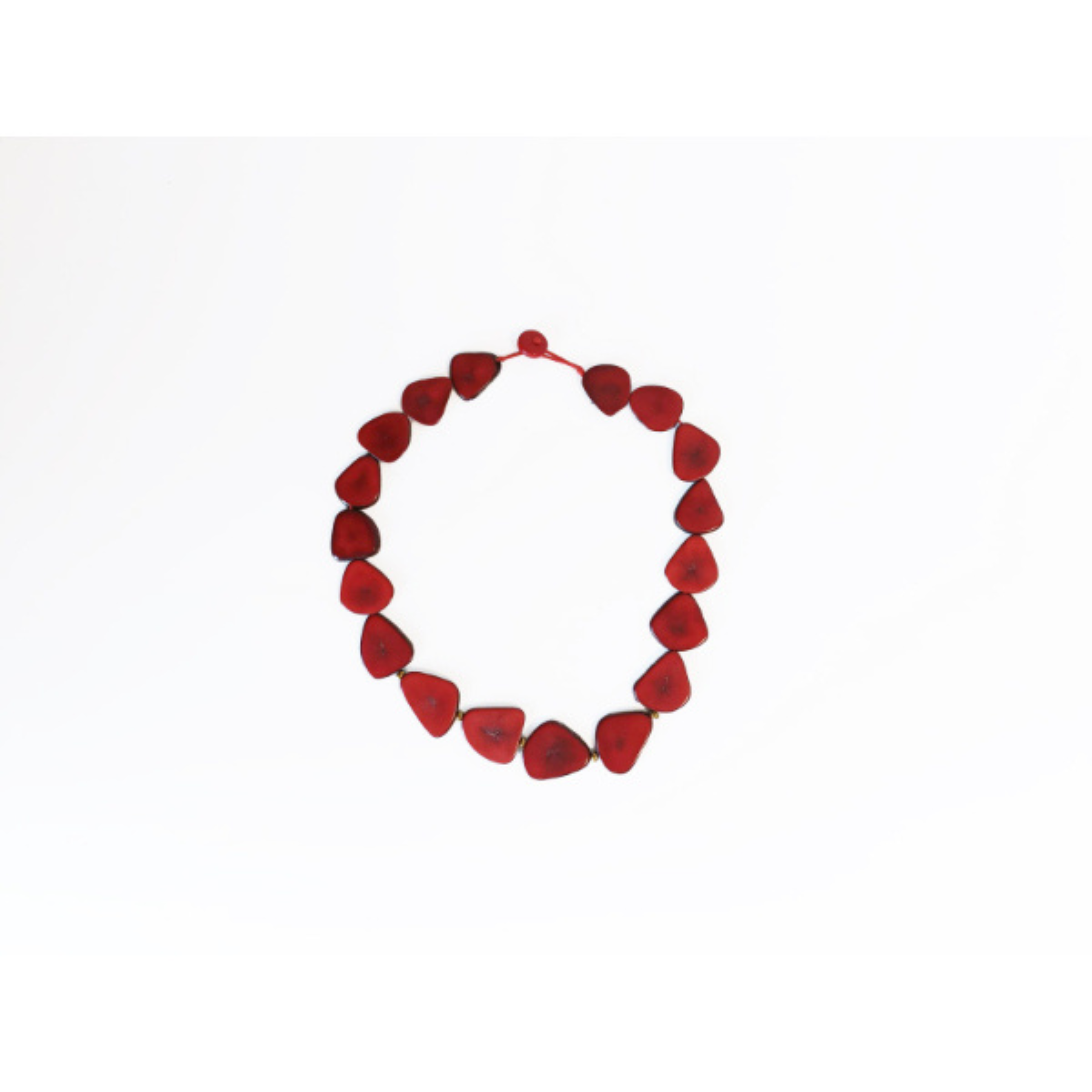 La Collana Gotas unisce il fascino naturale della tagua tagliata a cuore con perle di vetro rosso, creando un effetto delicato ma distintivo. Leggera e versatile, aggiunge un tocco di colore etico ad ogni outfit.
