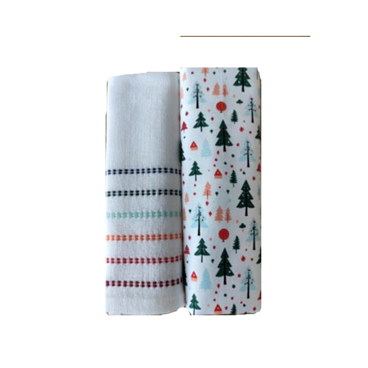 Set da due asciugapiatti in cotone, fantasia “Inverno” con alberelli stilizzati e variante a righe ricamate. Artigianali, resistenti e realizzati in commercio equo-solidale.