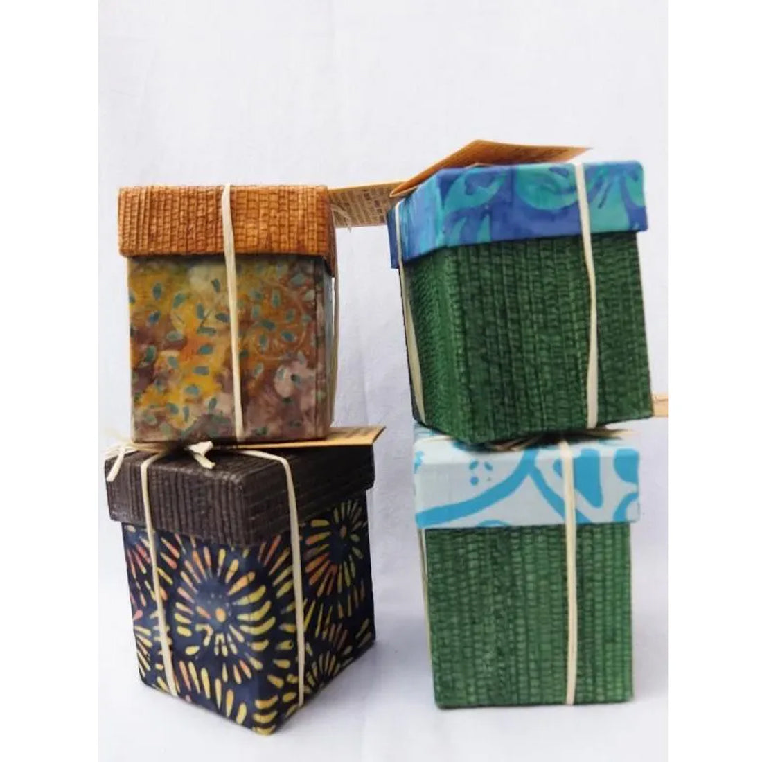 Le scatole rivestite di foglie e tessuti batik sono realizzate a mano dagli artigiani di Arum Dalu Mekar (Indonesia), custodi delle tradizioni balinesi di essiccazione delle foglie e tintura batik.