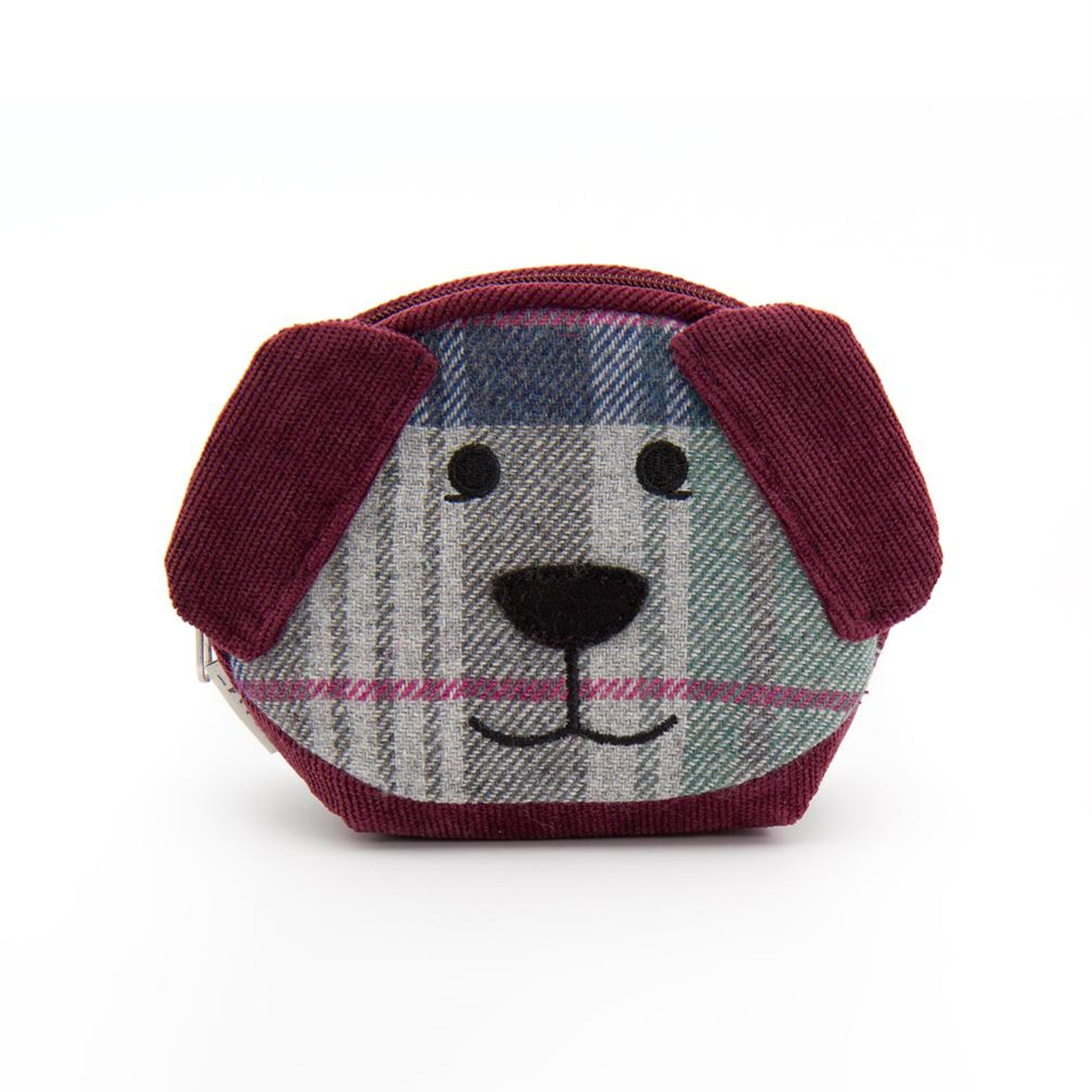Portamonete in tweed e velluto a coste bordeaux a forma di cane.