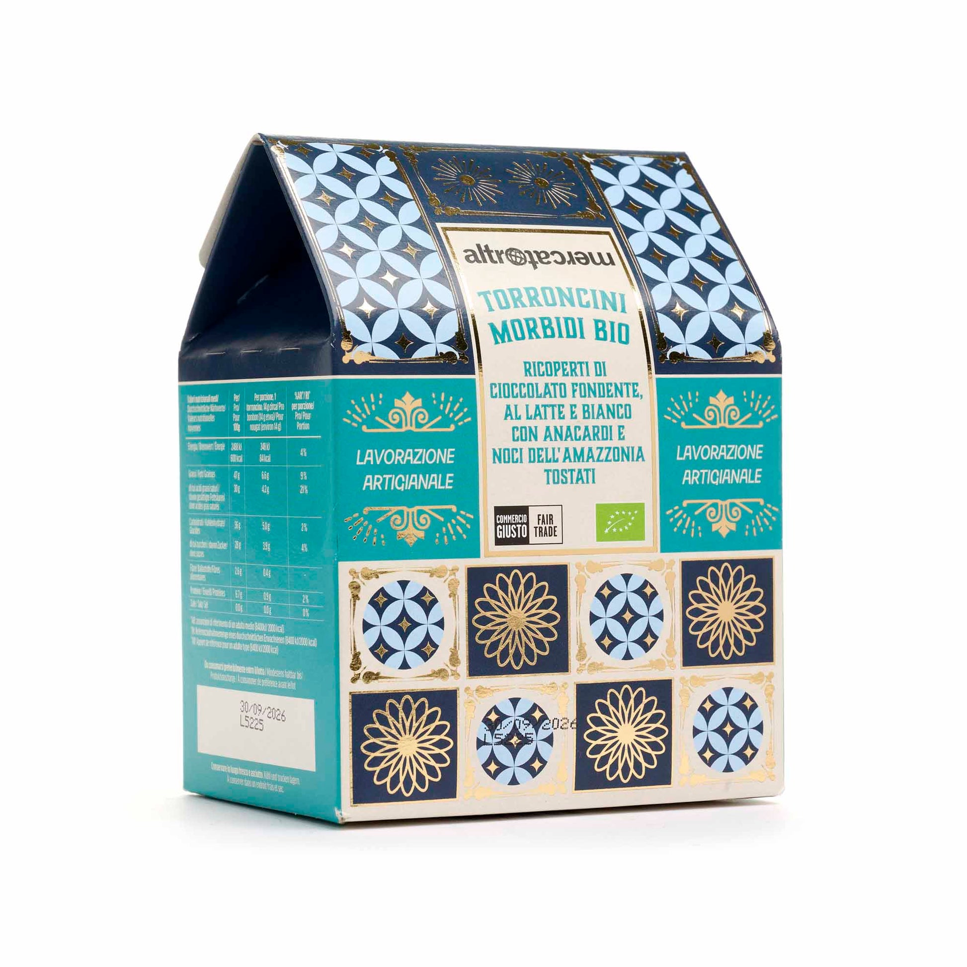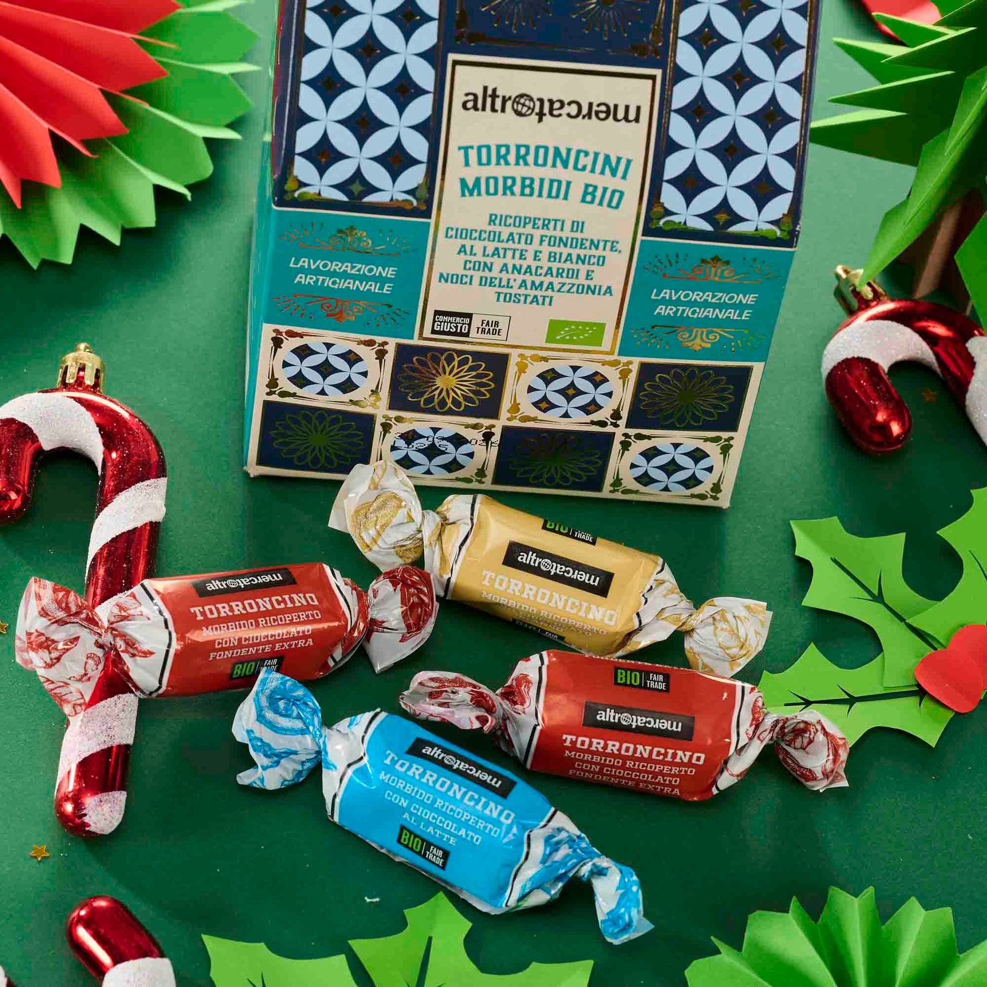 I nostri torroncini sono il frutto di ingredienti equosolidali sapientemente lavorati da artigiani torronieri secondo tradizione. La copertura ai tre cioccolati avvolge un morbido ripieno di miele da fioritura spontanea, zucchero di canna e deliziose noci dell’Amazzonia, regalandoti un morso buono per te e per tutti.