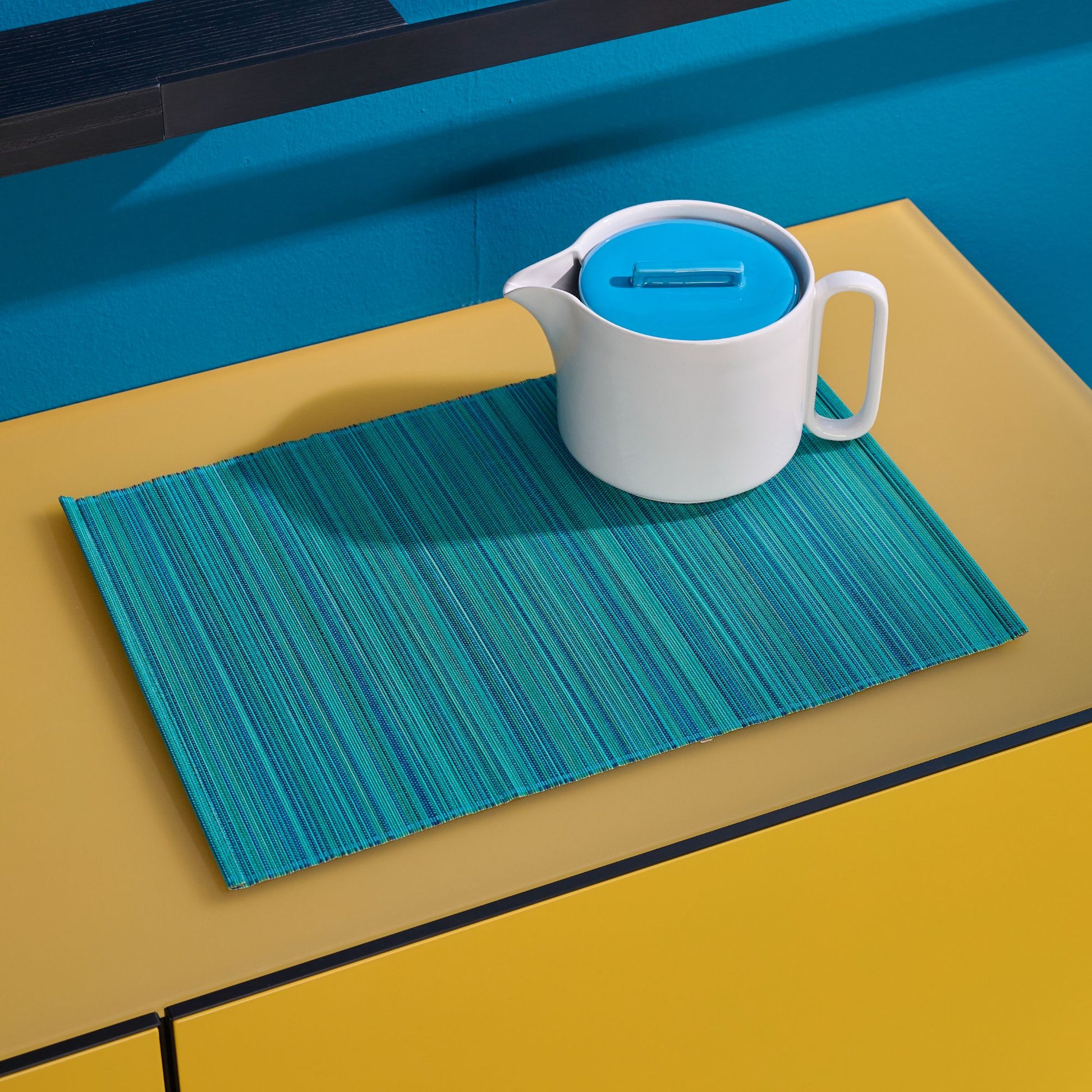 Arrotolabili e facili da pulire e riporre, queste tovagliette sono realizzate nella fibra di una particolare varietà di bambù, la Giung plant, resistente ma flessibile e levigata. La lavorazione richiede numerosi passaggi che vanno dalla selezione di calibro e lunghezza della canna di bambù alla scorticatura della corteccia esterna, procedendo poi con la divisione delle barre in strisce sempre più piccole, cui seguono le fasi di tintura e asciugatura della fibra e della tessitura a mano. C’è quindi un prezioso lavoro artigianale dietro alla realizzazione di queste coloratissime tovagliette in bambù e cotone.